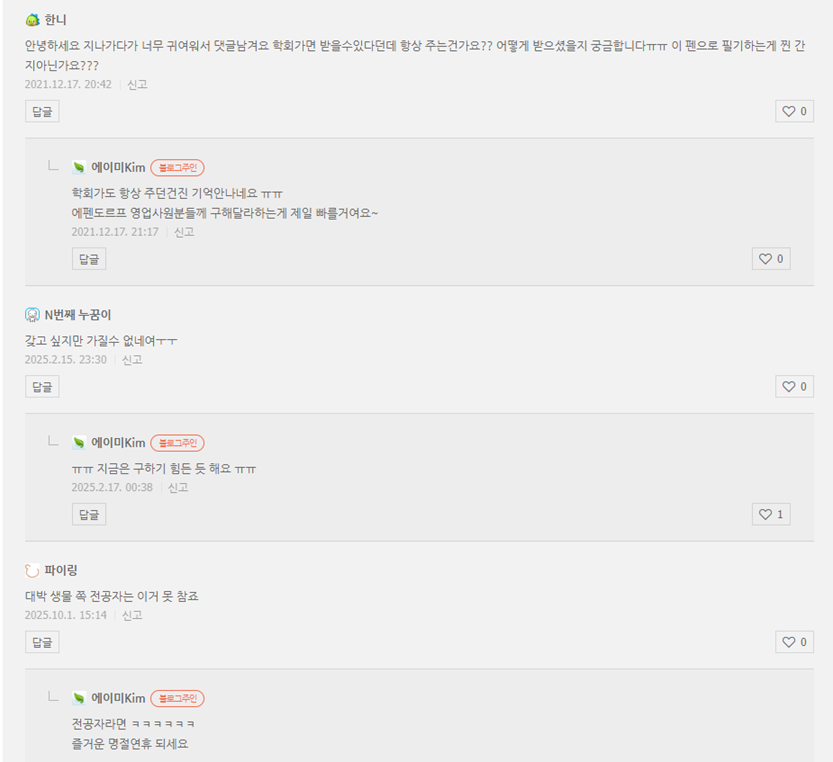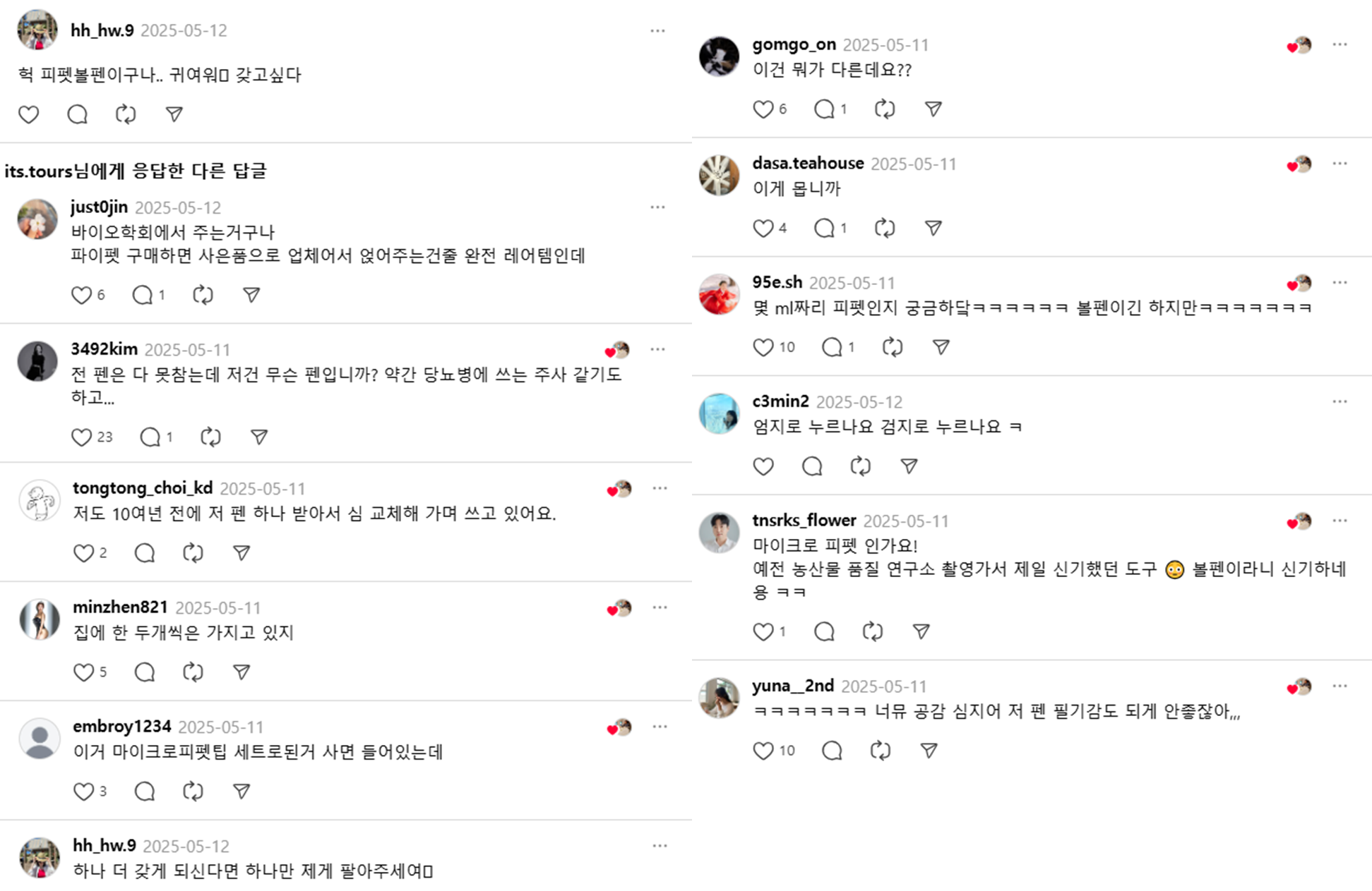 반응을 조금 더 세분화하면 디자인에 대한 호감이 가장 먼저 나타난다. 익숙한 연구 도구를 일상용 필기구로 옮겨 놓았다는 점에서 신선하다는 평가가 많고, 특히 실험실 또는 학회에서 선물로 받는 경우 만족도가 높다. 실험실 사람들끼리 공유하거나, 학회 부스에서 제공하는 굿즈로 나눠 가지는 과정에서 자연스럽게 화제성이 생기며 작은 커뮤니티 문화의 일부처럼 동작한다.