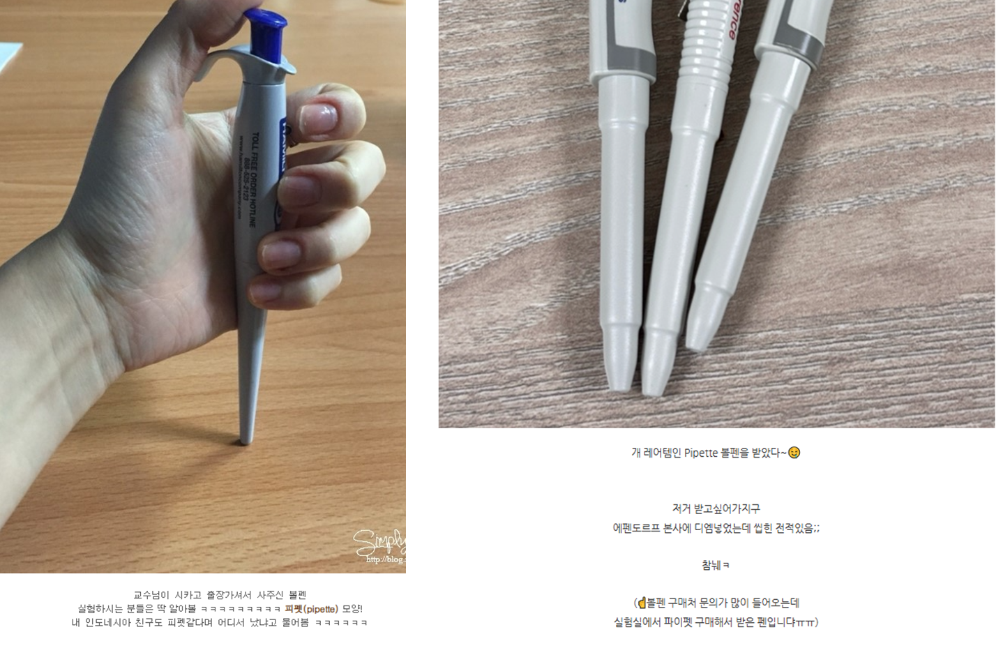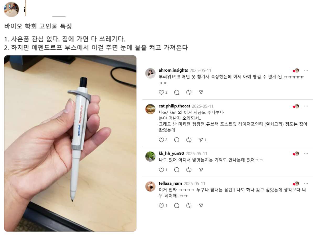- 마이크로피펫 볼펜(피펫 펜)은 단순 문구가 아니라 연구자 커뮤니티에서 정체성과 소속감을 표현하는 수단으로 충분히 자리 잡고 있다.