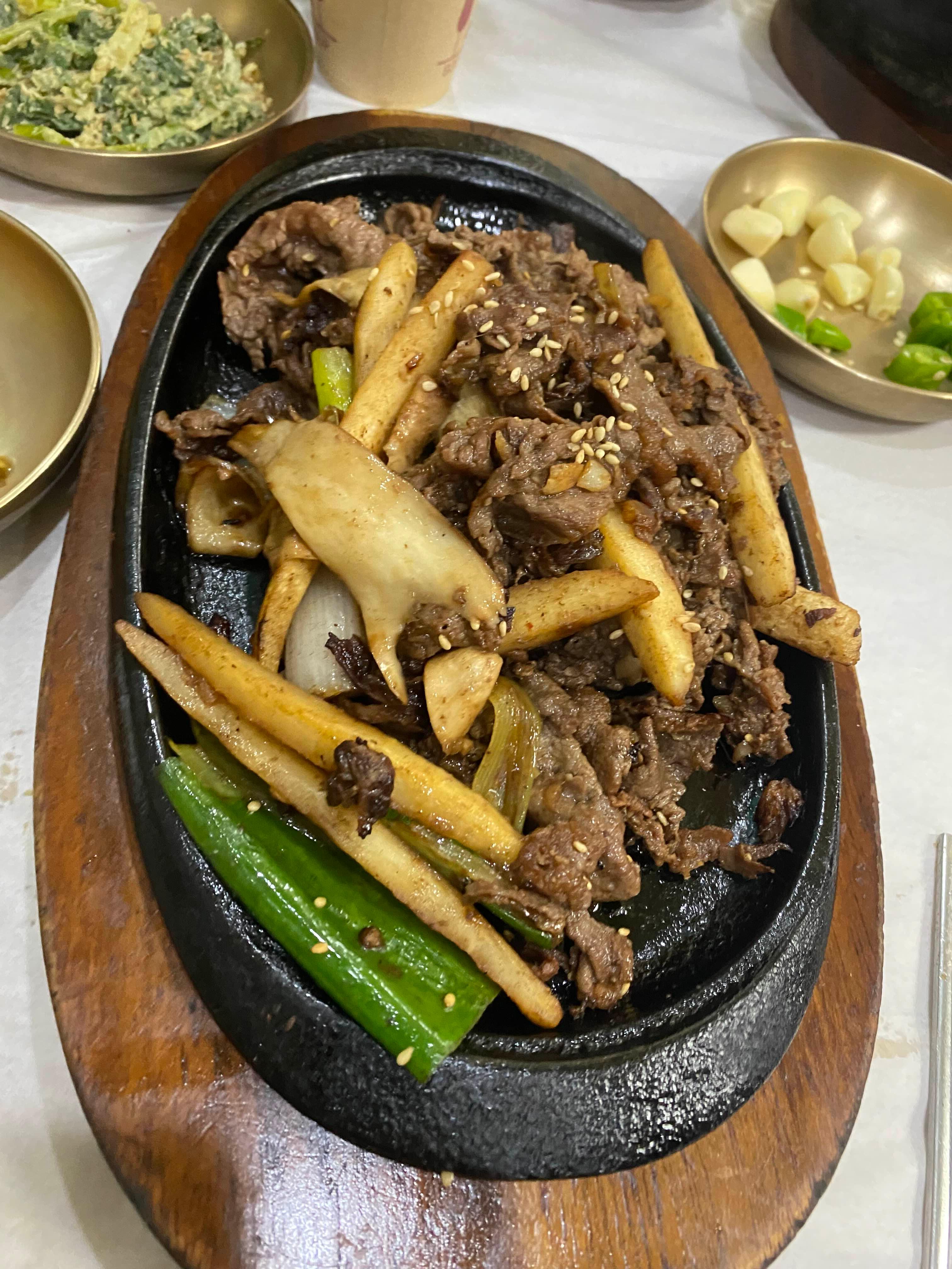 대표 메뉴인 우렁 쌈밥은 이 집의 정체성을 가장 잘 보여주는 메뉴다. 통통한 우렁이가 전통 된장 베이스로 볶아져 나오는데, 된장의 구수함이 깊게 깔리면서도 짠맛이 과하지 않다. 우렁 특유의 식감이 쌈채소와 조화를 이루면서 씹는 구조가 단조롭지 않고, 쌈밥이라는 음식 구조 자체가 완성도 있게 연결된다.